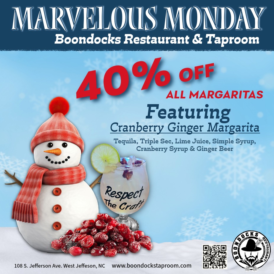 Come out every Monday for 40% off all margaritas! This month's feature is Cranberry Ginger!