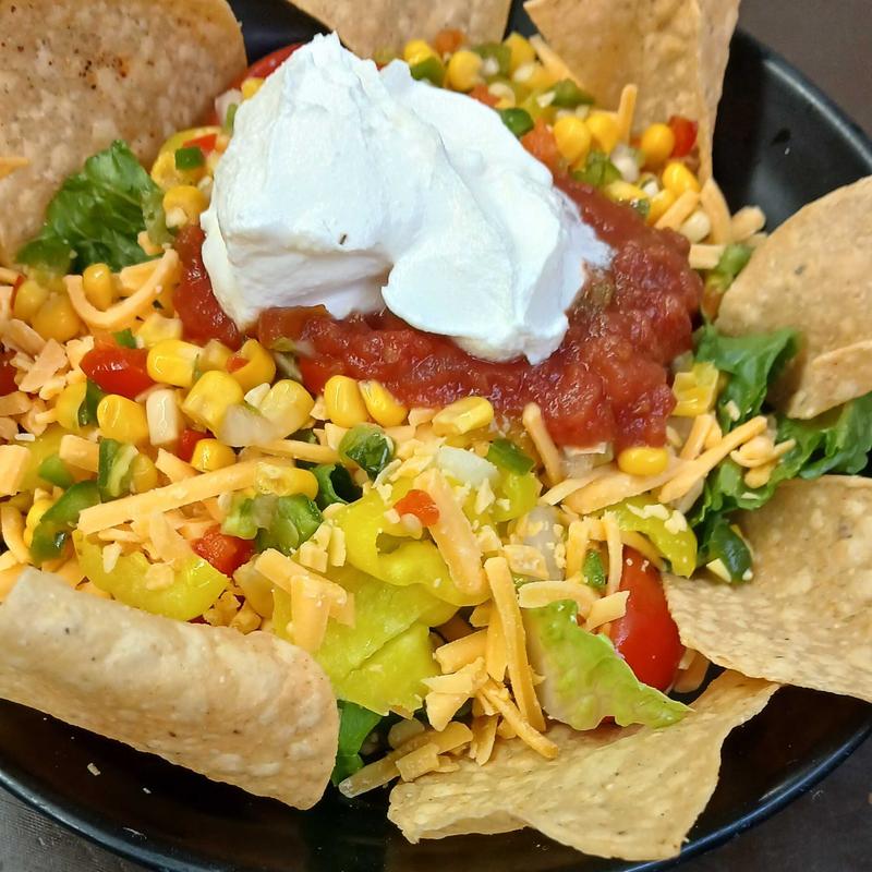 Seasoned shredded chicken, crisp romaine & iceberg lettuce, tomatoes, onions, corn salsa, banana peppers, tortilla strips, salsa, sour cream and chipotle ranch dressing.